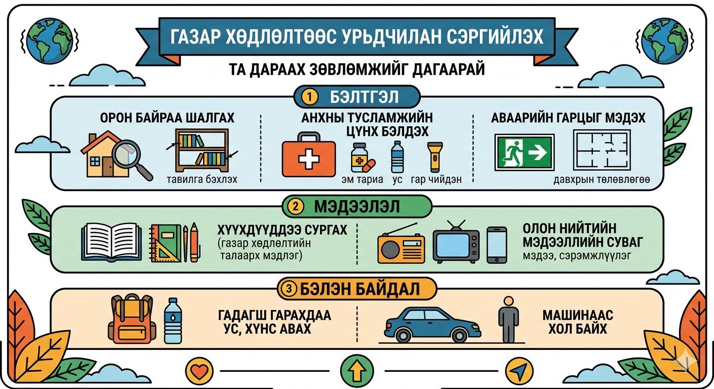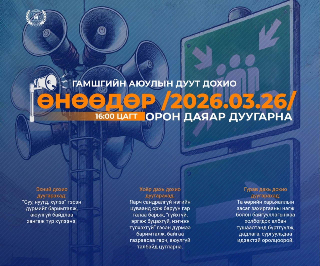 Энэ дагуу 2026 оны 03 дугаар сарын 26-ны өдрийн 16:00 цагт орон даяар гамшгийн аюулын тухай зарлан мэдээллийн дохиогоор ажиллах дадлага сургуулийг зохион байгуулах тул иргэн, аж ахуйн нэгж, байгууллага та бүхэн идэвхтэй оролцоно уу.